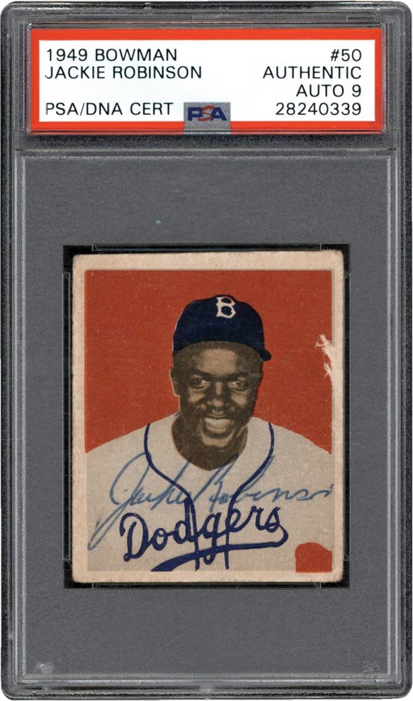 Lot #  4:  1949 Bowman Baseball #50 Jackie Robinson Signed Card PSA Authentic Auto 9