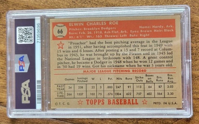 1952 TOPPS RED BACK CARD PREACHER ROE BROOKLYN DODGERS CARDINALS # 16 PSA 5 EX