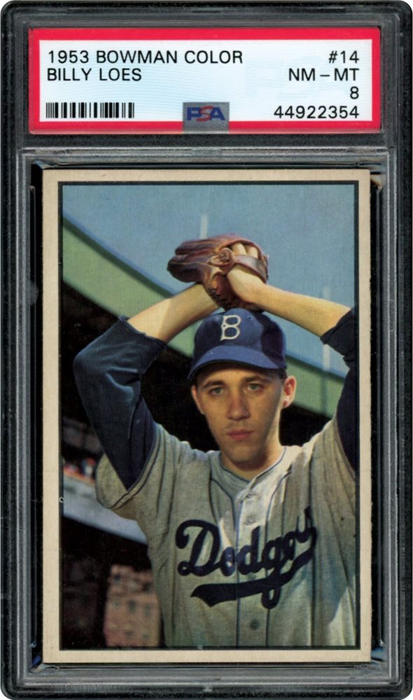 Lot # 888: 1953 Bowman Color #14 Billy Loes PSA 8 NM-MT