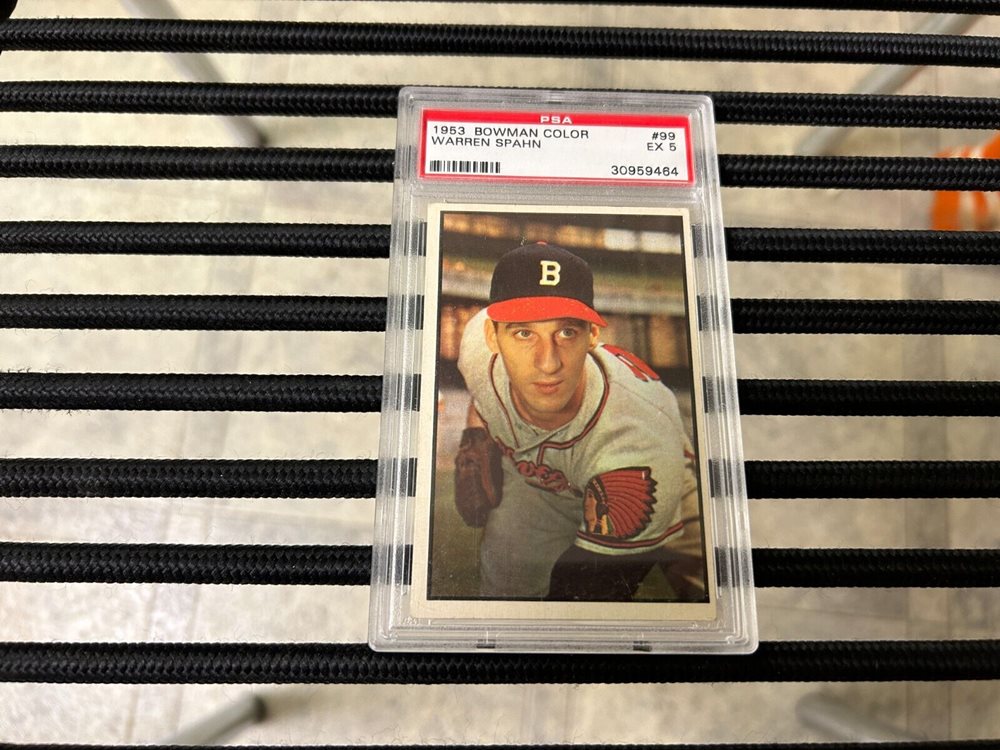original 1953 BOWMAN COLOR BASEBALL CARD of WARREN SPAHN # 99..PSA EX 5