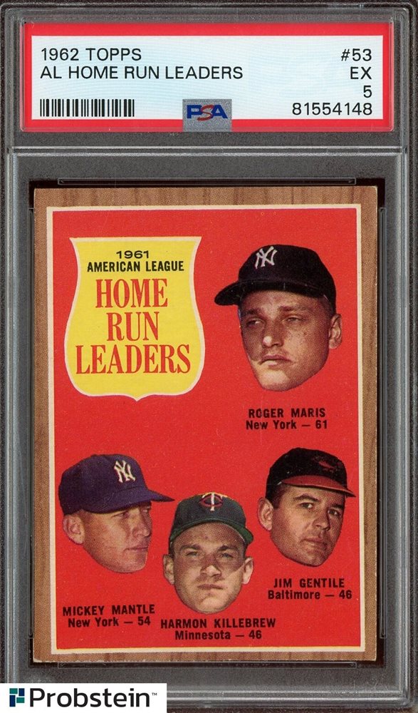 1962 Topps #53 AL Home Run Leaders w/ Mickey Mantle Harmon Killebrew HOF PSA 5
