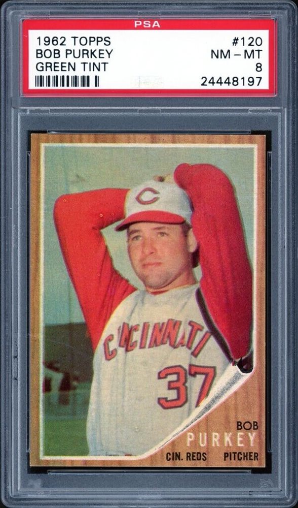 1962 TOPPS BASEBALL #120A BOB PURKEY (GREEN TINT) CINCINNATI PSA 8 NM-MT Pop 13