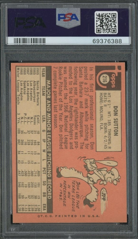 1969 Topps #216 Don Sutton Los Angeles Dodgers HOF PSA 9 MINT