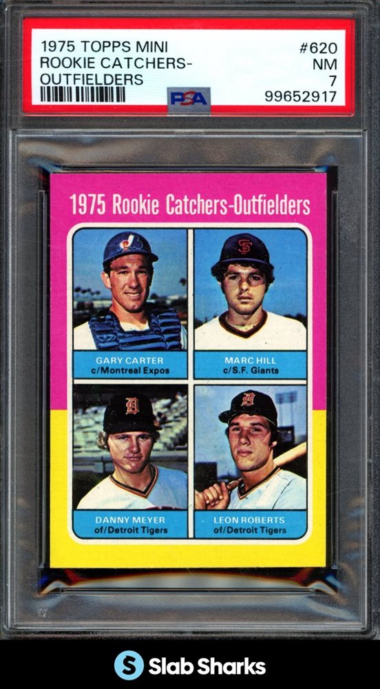1975 TOPPS MINI #620 ROOKIE CATCHERS-OUTFIELDERS CARTER/HILL/MEYER/ROBERTS PSA 7