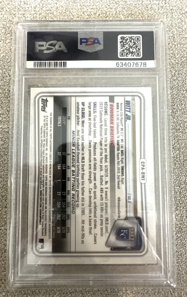 2020 Bowman Chrome 1st Bobby Witt Jr Speckle Refractor Auto /299 PSA 9 Auto 10