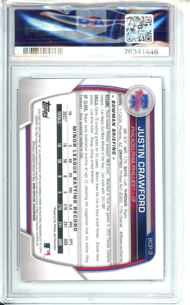 2023 Bowman Chrome Justin Crawford 1st Bowman Aqua Lunar Crater /125 PSA 10