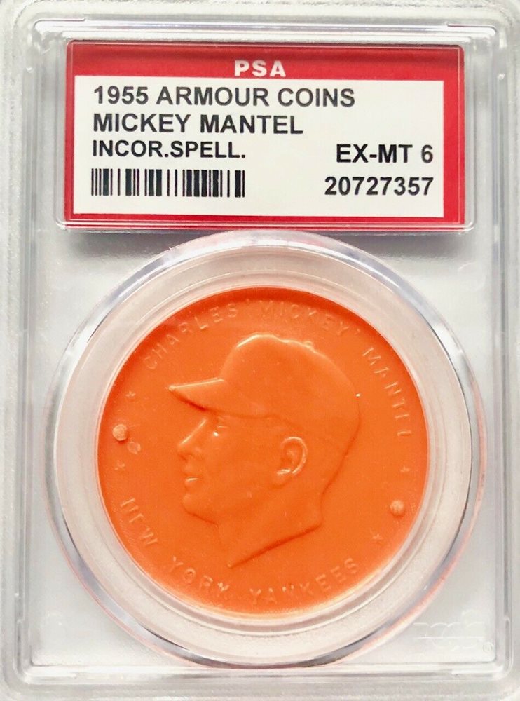 1955 ARMOUR COIN MICKEY MANTLE INCORRECT SPELLING PSA 6 ORANGE