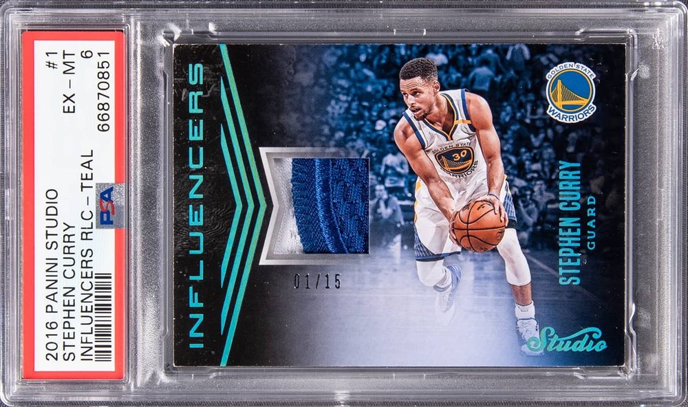 2016-17 Panini Studio Influencers Relics Teal #1 Stephen Curry Patch Card (#01/15) – PSA EX-MT 6 – Pop 1