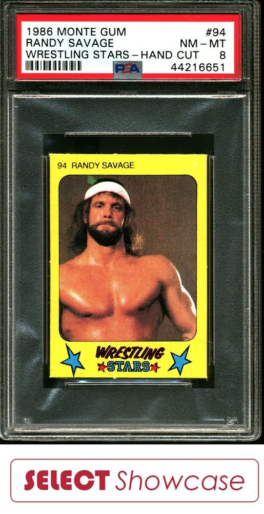 1986 MONTY GUM WRESTLING STARS HAND CUT #94 MACHO MAN RANDY SAVAGE PSA 8
