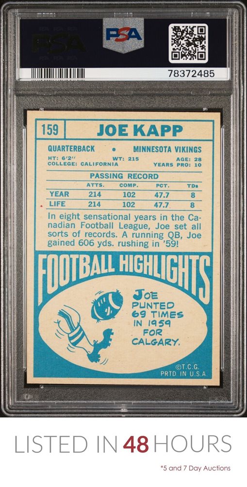 1968 TOPPS #159 JOE KAPP RC VIKINGS HOF PSA 8