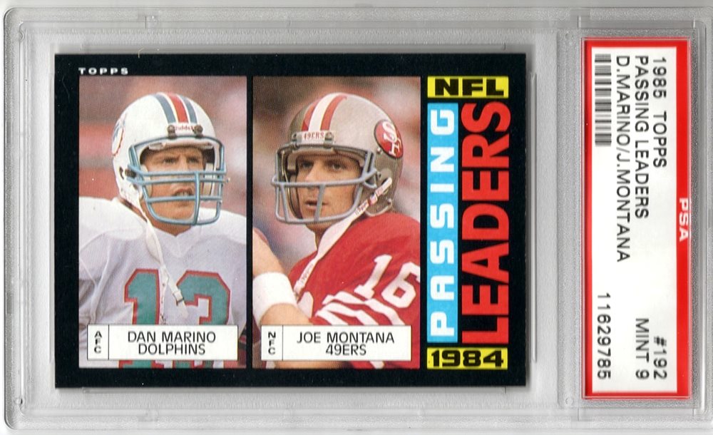 1985 Topps #192 PASSING LEADERS Dan Marino / Joe Montana PSA 9 MINT