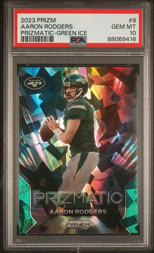 2023 Prizm AARON RODGERS Prizmatic Green Ice SSP NY Jets PSA 10 GEM MT POP 15