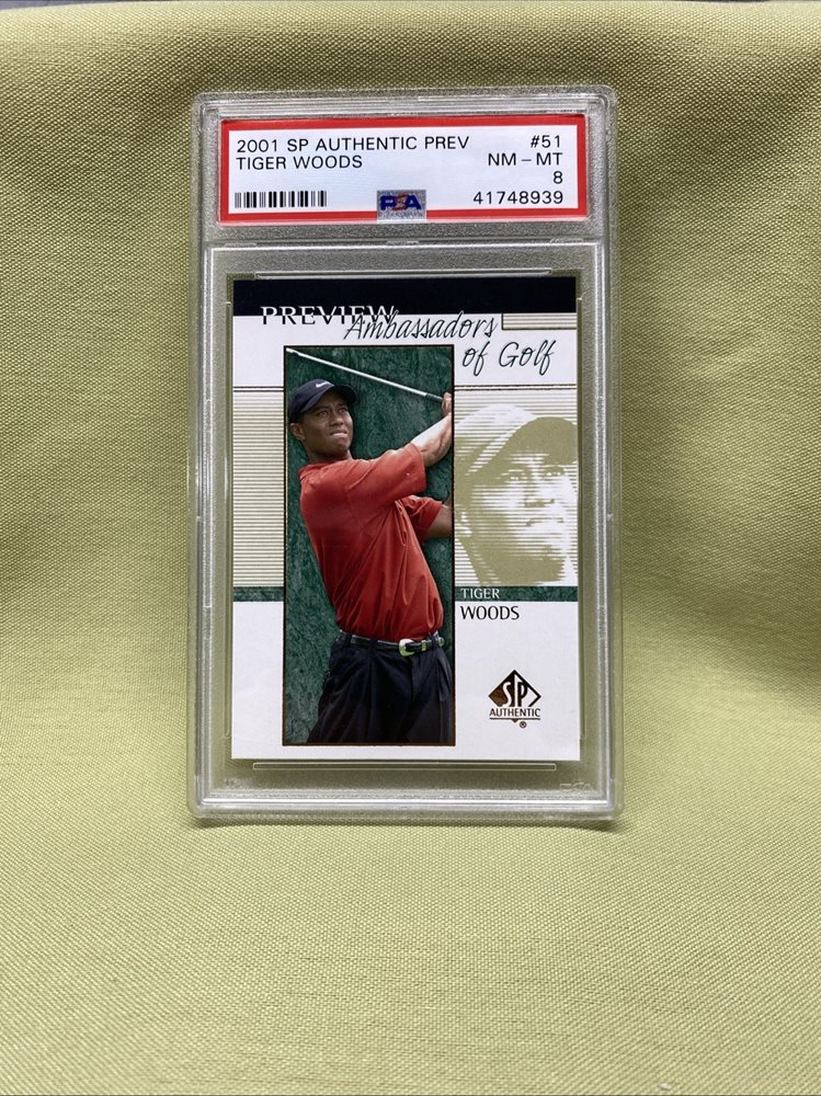 2001 SP Authentic Preview Tiger Woods Ambassadors of Golf Rookie RC #51 PSA 8