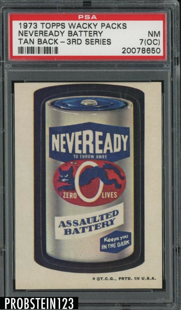 1973 Topps Wacky Packs 3rd Series Neveready Battery Tan Back PSA 7 NM (OC)