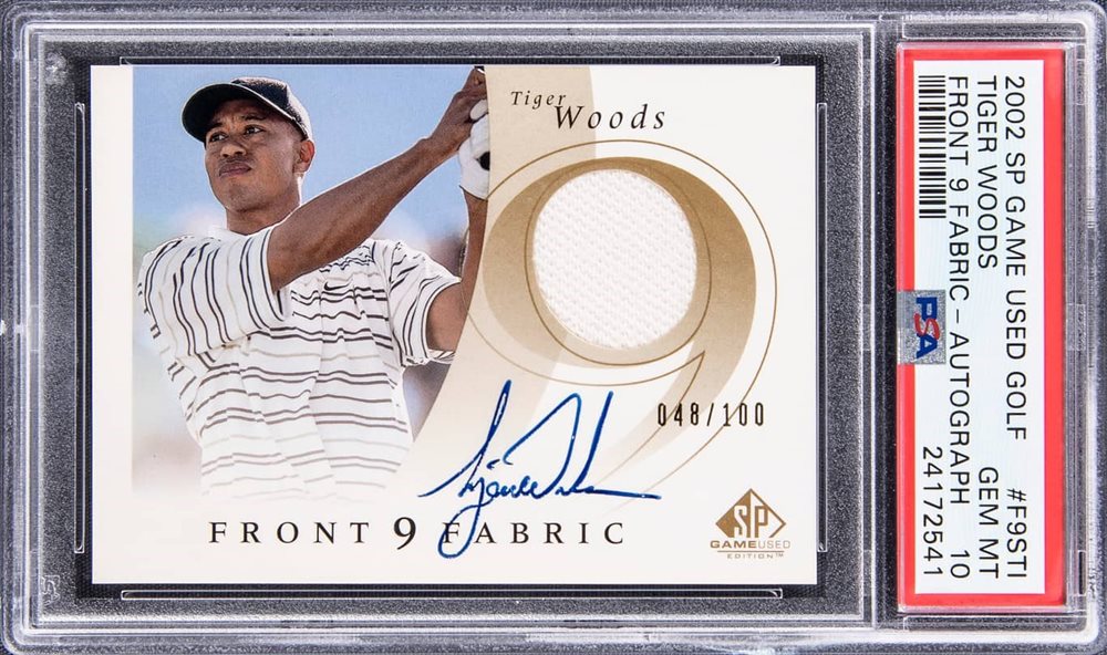 2002 Upper Deck SP Game Used Golf Front 9 Fabric Autograph #F9STI Tiger Woods Signed Patch Card (#048/100) - PSA GEM MT 10 - Pop 15
