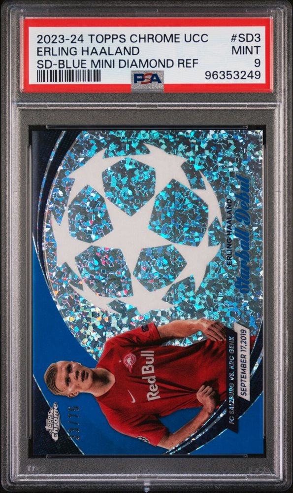 2023-24 TOPPS CHROME UCC BLUE MINI DIAMOND #SD3 ERLING HAALAND 33/75 PSA 9