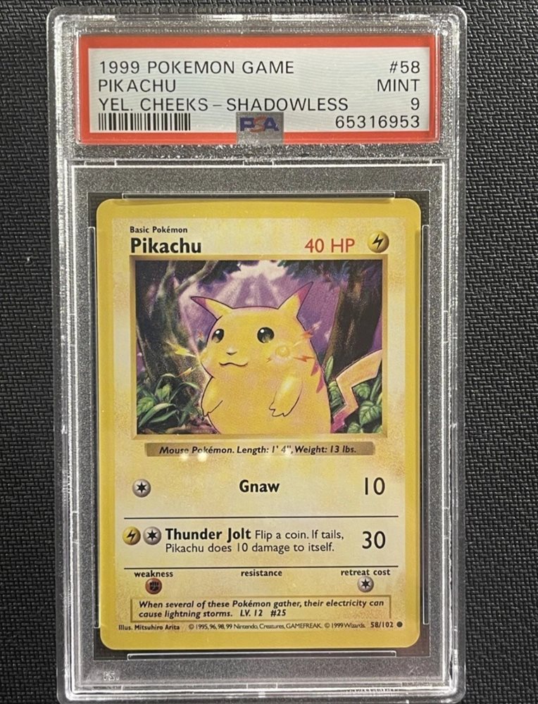 Pokemon TCG Cards SHADOWLESS Pikachu 58/102 Base Set Yellow Cheeks PSA 9
