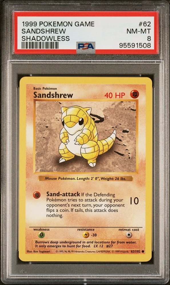 1999 POKEMON BASE SET SHADOWLESS #62 SANDSHREW PSA 8
