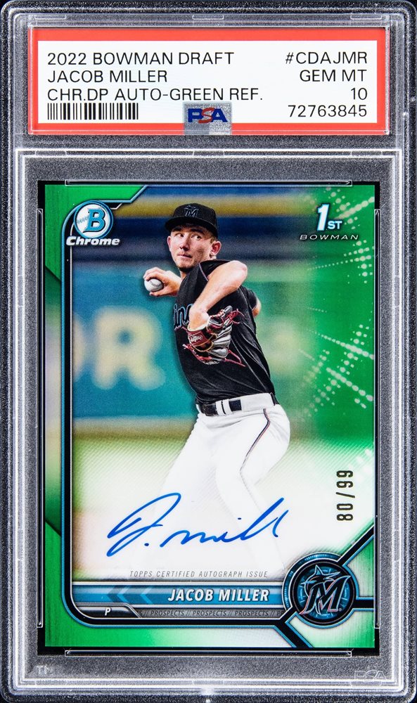 2022 Bowman Draft Chrome Draft Pick Autograph - Green Refractor #CDAJMR Jacob Miller Signed Rookie Card (#80/99) - PSA GEM MT 10