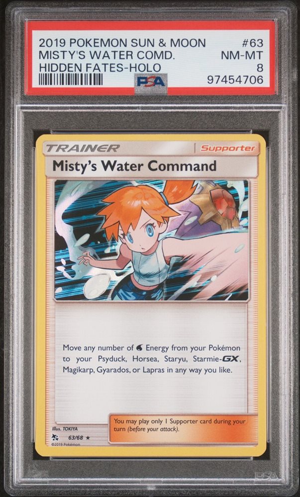 2019 POKEMON SUN & MOON HIDDEN FATES #63 MISTY'S WATER COMMAND-HOLO PSA 8