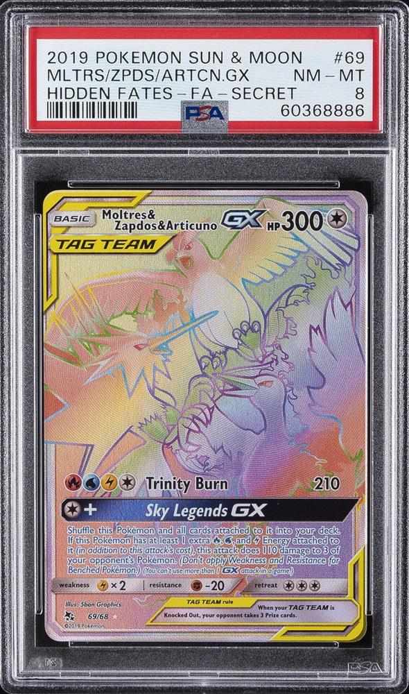 2019 POKEMON SUN & MOON SECRET #69 FULL ART/MOLTRES & ZAPDOS & ARTICUNO GX PSA 8