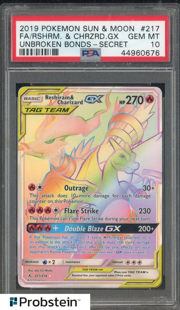 2019 Pokemno S & M Unbroken Bonds Secret FA #217 Reshiram & Charizard Gx PSA 10