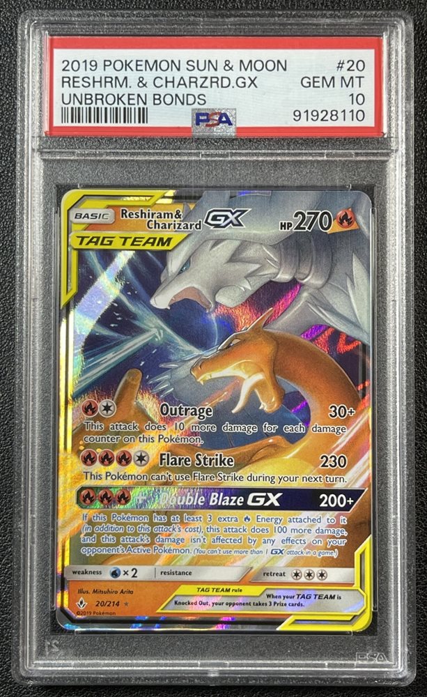RESHIRAM & CHARIZARD GX PSA 10 2019 POKEMON SUN MOON UNBROKEN BONDS #20/214 HOLO